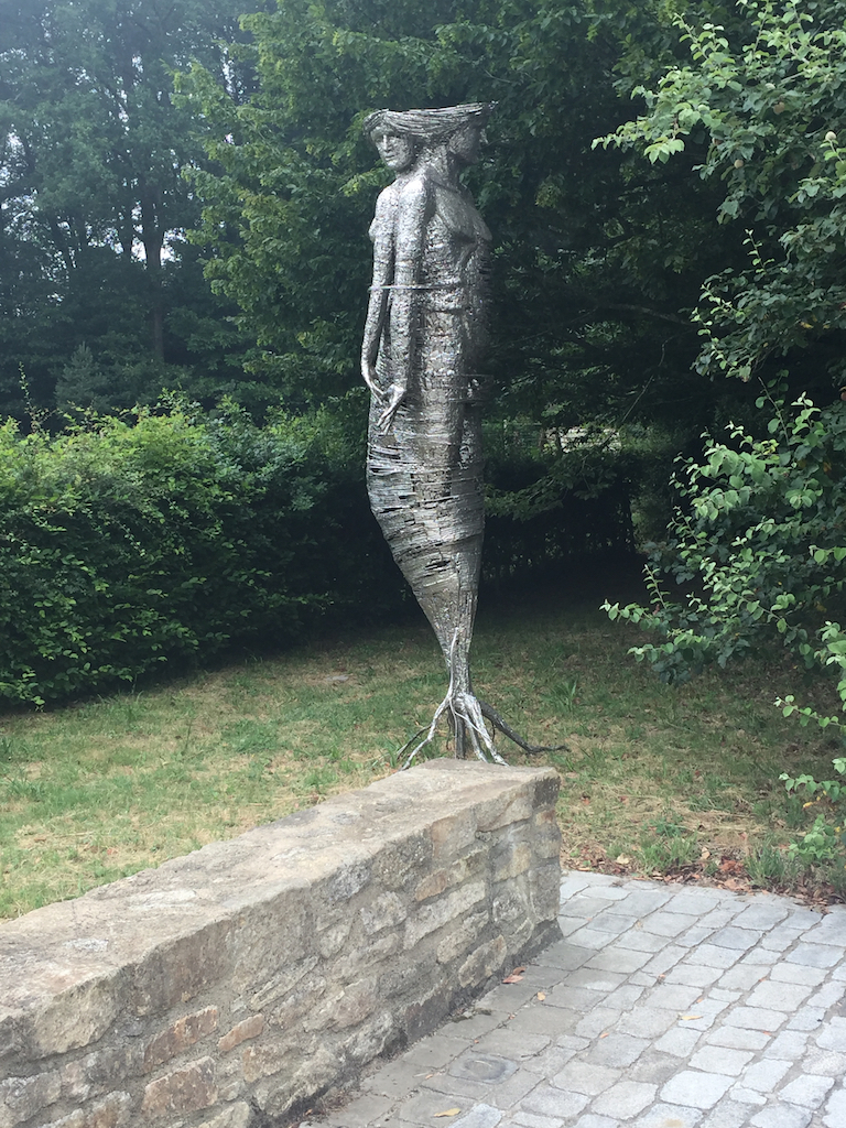 L’eau est partout présente, sous forme de bassin artificiel ou d’espace naturel laissé à la vie sauvage. Quand on se promène dans le parc, on tombe sur des statues de bois ou de métal réalisées par Serge Sangan, qui apportent un peu de matière froide à cet environnement vert et liquide.