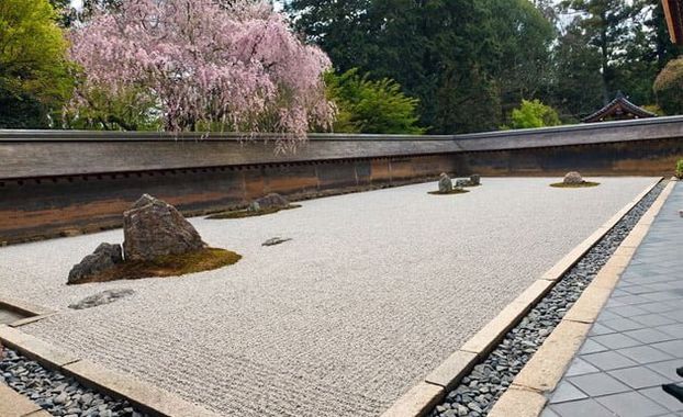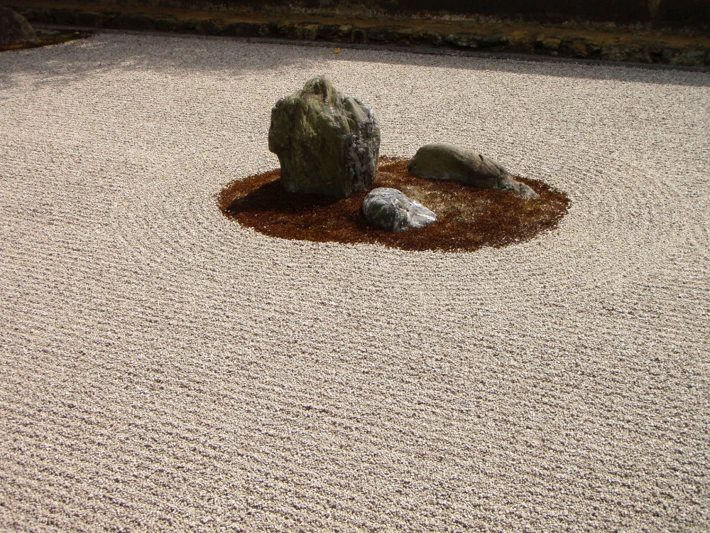 Le jardin japonais le plus célèbre est sans doute le Ryôan-Ji : c’est un Kare-sansui (paysage sec) composé de 15 pierres mystérieuses tant dans leur signification symbolique que leur provenance et la date de leur agencement (sans doute vers le XVe siècle). Les interprétations et tentative de décryptages du jardin sont nombreuses, la plus simple étant celle de la représentation d’une mer symbolisée par les graviers blancs baignant 15 îles montagneuses. Ou bien ce sont les sommets d’une chaîne de montagne au-dessus d’une mer de nuage. On peut y voir également une tigresse qui mène ses petits à la rive. L’interprétation bouddhiste y voit la représentation des phénomènes sensoriels par les pierres et l’espace vide des graviers est le « mu » la vacuité.
