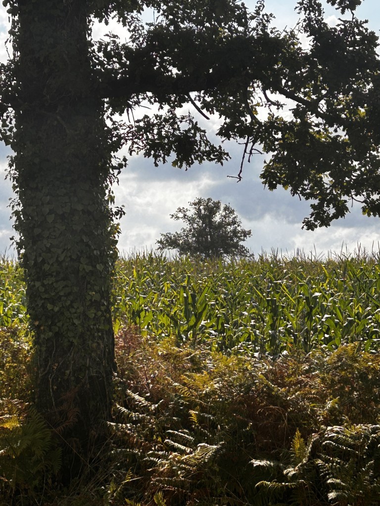 Dimanche après midi. Un petit rayon de soleil après un jour et demie de grisaille et de brouillard. Aller hop ! J’enfile mes baskets, et je vais marcher. Au loin on entend des coups de feu : les chasseurs ! Ils sont loin mais pourtant il vaut mieux rester sur la route. Je croise une connaissance qui va dans l’autre sens : on se salue et on échange quelques mots. Il fait chaud et on entend les oiseaux, le vent dans les arbres. Les agriculteurs n’ont pas encore récolté le maïs qui a bien poussé cette année. Les fougères commencent à brunir et dans les haies on commence à voir quelques feuilles rouges. Je sonne chez des voisins pour discuter, boire un thé. Mais ils ne sont pas là, sans doute dans la famille. Au loin j’aperçois d’autres promeneurs : tout le monde a eu la même idée ! Mais je rebrousse chemin car à l’ouest des nuages gris s’amoncellent et le vent se lève. J’accélère le pas même s’il ne pleut pas. J’irais voir des amis qui habitent plus loin une autre fois. C’est cela la vie à la campagne…