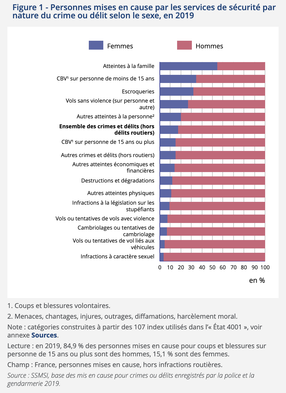 • En France, cette surreprésentation masculine se confirme également dans les statistiques générales de criminalité. En 2019, 82% des personnes mises en cause par la police ou la gendarmerie pour un crime ou un délit étaient des hommes