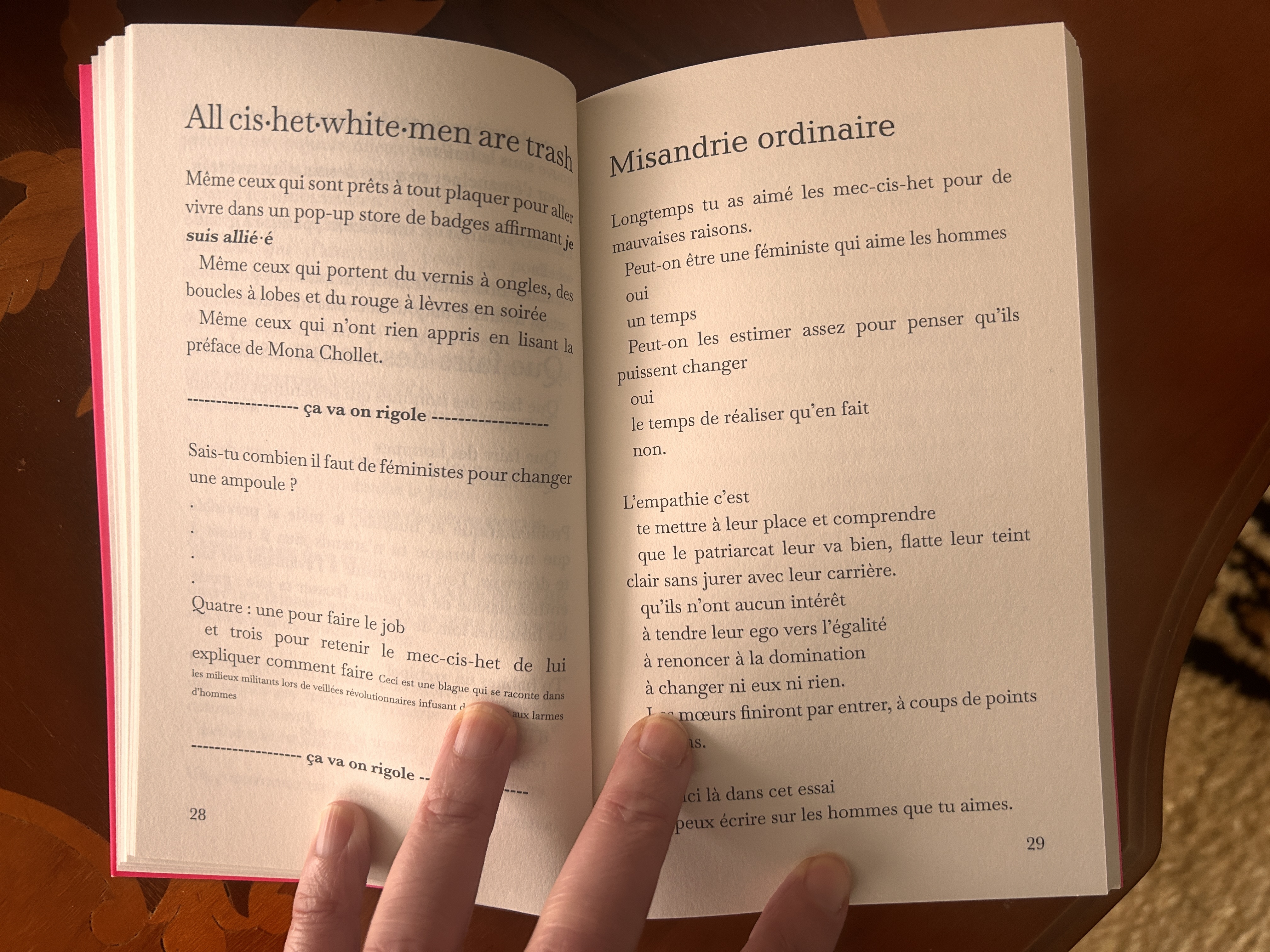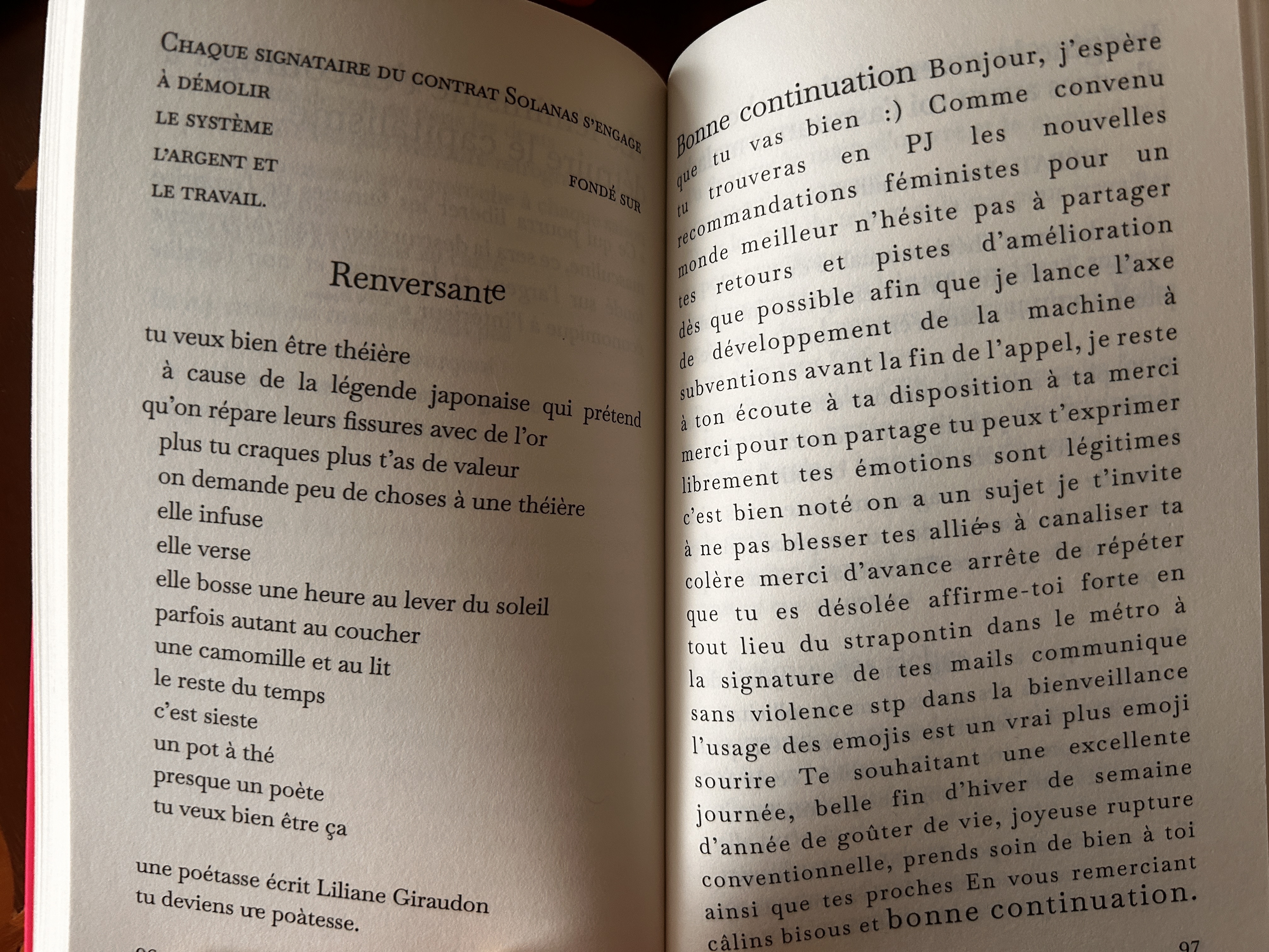 Comme d’autres lectrices, c’est à la fois la belle couverture rose pimpante et le titre immensément long qui m’ont tout d’abord poussé à lire ce livre. Puis, les échos que j’en avais : un texte radical. Enfin, en voyant quelques images passer des pages du livre, c’est l’expérience poétique et typographique qui m’ont enfin décidé à l’acheter, ou plutôt à le commander sur la plateforme Alip qui, dans la région des Pays de la Loire, permet aux habitants esseulés des campagnes profondes de commander des livres et d’aller les chercher dans leurs librairies indépendantes favorites. Je raconte cela car grâce au nouveau budget (de droite) de la région, gouvernée par l’héritière proclamée de l’actuel ministre de l’intérieur français (ferais-je de la politique sur mon blog ?), cette formidable plateforme, Alip donc, est condamnée à mort car les subventions régionales ont été totalement supprimées. Bref… le livre.