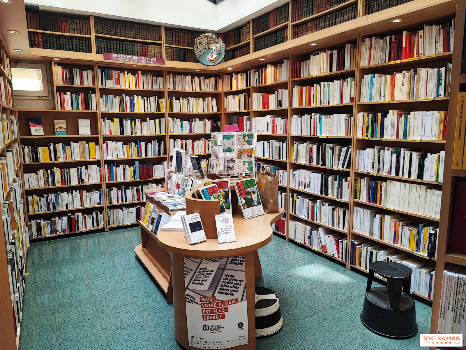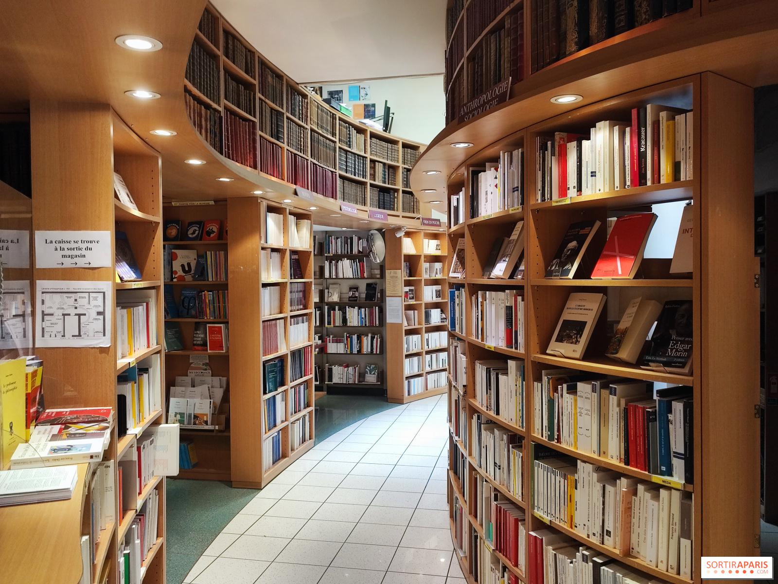 Ensuite un étroit couloir dessert des petites chapelles où sont rangés tous les classiques de la philosophie par ordre chronologique. Première chapelle : l’Antiquité ; deuxième chapelle : le Moyen Age ; nef principale : philosophie moderne et contemporaine. Le couloir semi circulaire est tapissé des livres exotiques : philosophies islamiques, orientales, bouddhistes, revues, un peu de psychologie. Ce couloir sombre débouche sur l’autre grande pièce de la librairie, plus lumineuse, et sa deuxième entrée qui comporte la caisse, tenue souvent, du moins quand je la fréquentais, par une vendeuse souriante qui portait toujours des turbans multicolores couronnant son visage aux grandes lunettes noires. Les vendeurs et vendeuses étaient d’ailleurs les seules portes vers le monde extérieur. Les voir ranger des livres ou sourire aux clients à la caisse était comme redescendre sur la planète après avoir voyagé durant quelques minutes dans un vaisseau spatial.