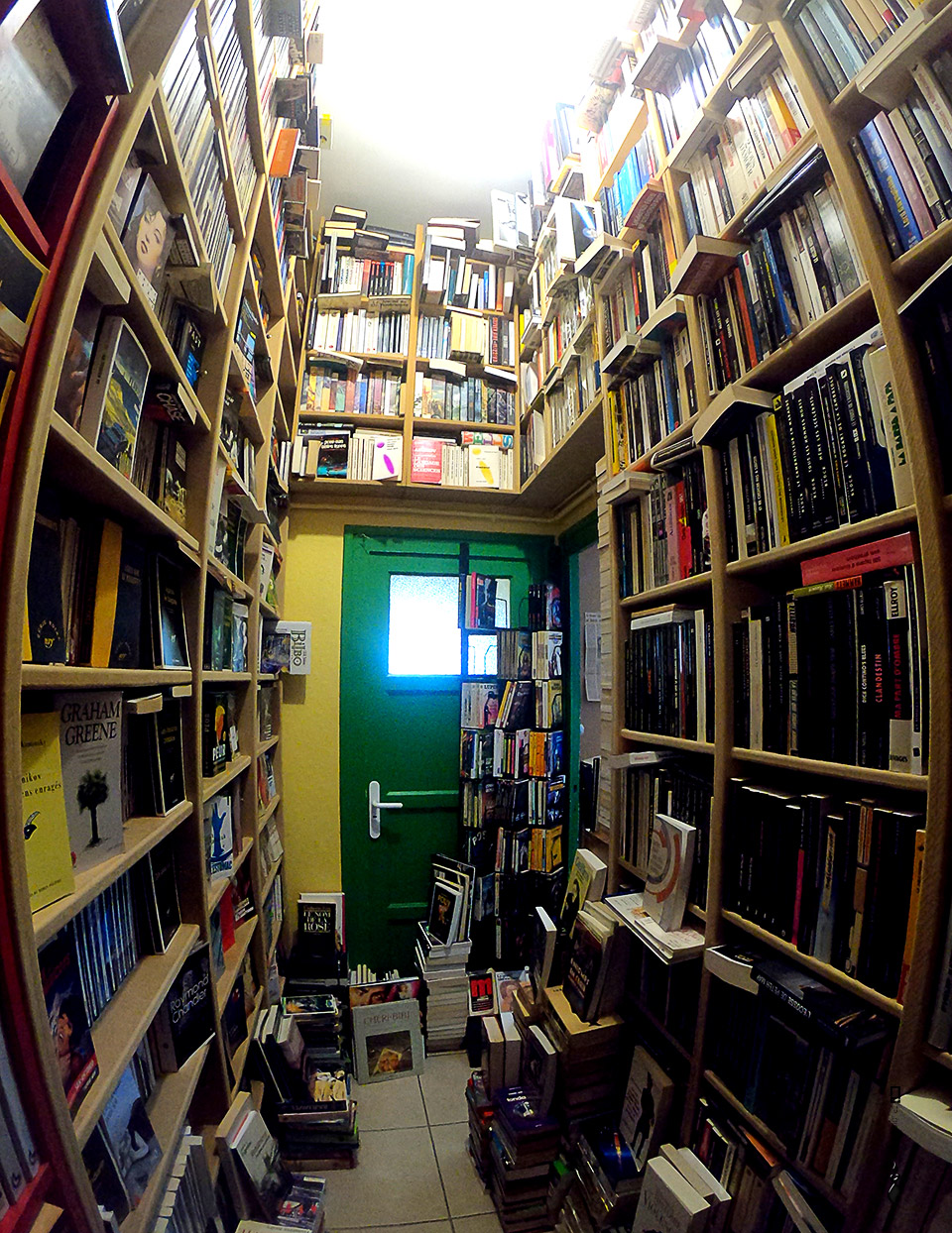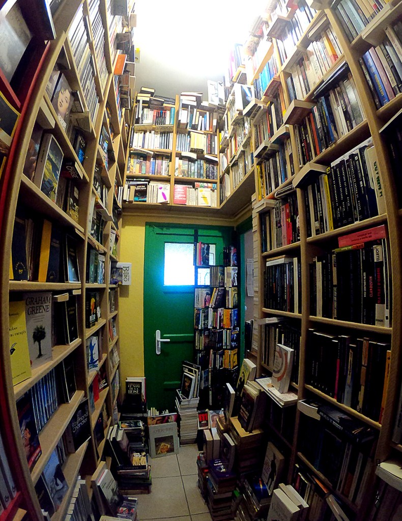 Le couloir est un cul de sac qui s’ouvre en fait sur la droite sur une troisième pièce. Et là, c’est le frisson. Une cathédrale de livres brochés s’offre à vos yeux. Une haute fenêtre éclaire une caverne des Milles et Unes nuits. La pièce plus haute que la moyenne (à moins que cela ne soit une illusion d’optique) est tapissée jusqu’au plafond de livres. Une échelle miraculeuse vous tend ses barreaux pour tenter d’aller approcher les spécimens de la canopée. De toute façon elle est nécessaire si vous voulez lire ne serait-ce que les titres. Toujours au sol les piles de livres. Ici ce sont les livres de littérature et les essais en grand format. Les éditions anciennes des textes les plus rares ou les romans récents déjà revendus par des lecteurs peu enthousiastes sans doute. Cette pièce cachée, car on ne peut soupçonner son existence quand on se trouve à l’entrée de la boutique, est le Saint Graal des lecteurs et des chineurs de livres. C’est un cocon où les livres protègent un silence digne d’une salle insonorisé d’un hôpital psychiatrique.