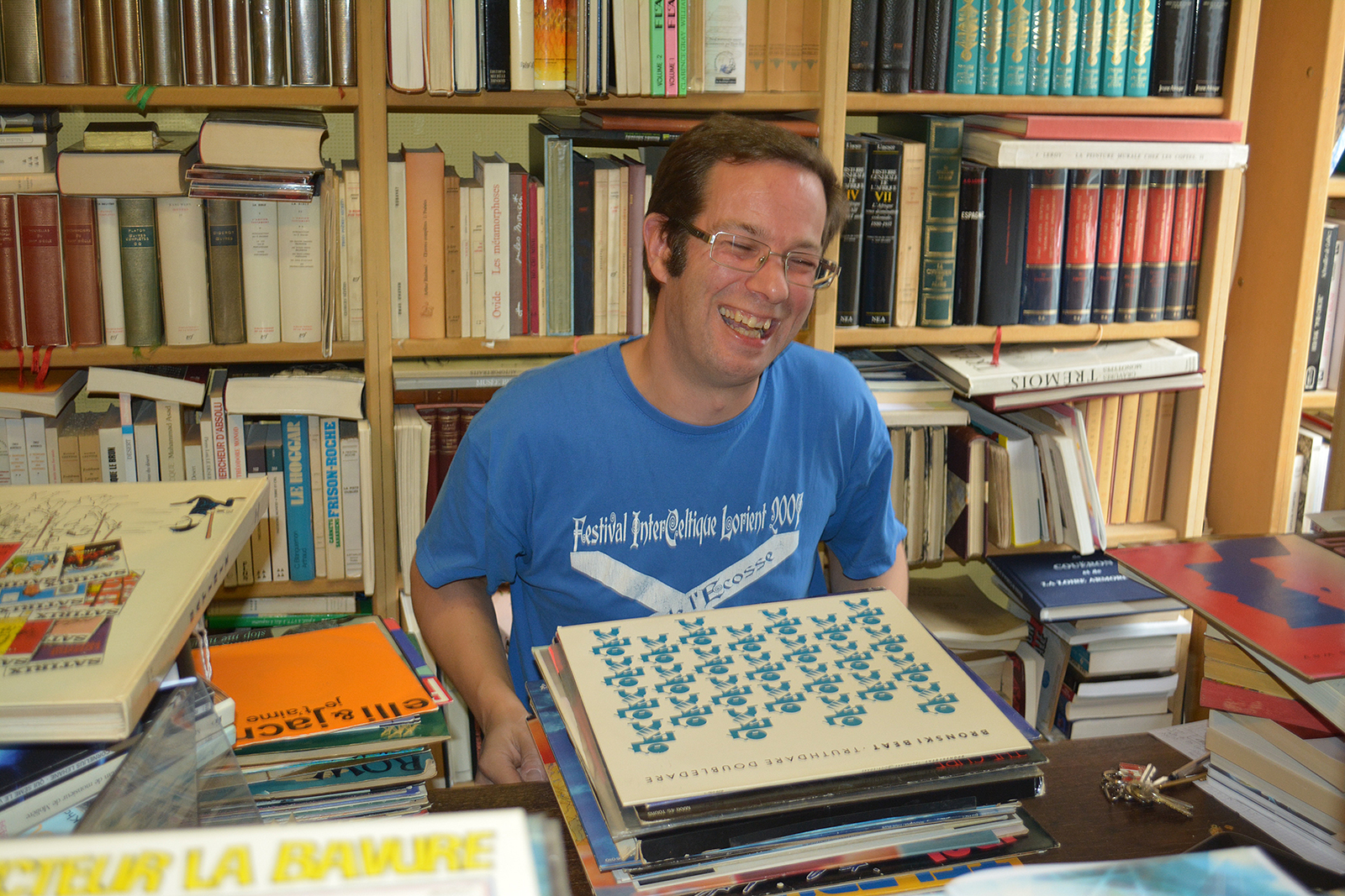 La bouquinerie des Idées Larges est avant tout une aventure humaine. Celle du bouquiniste, Ludo, Ludovid Riou, que l’on retrouve régulièrement dans tous les moments culturels de la ville et qui se cache avec bonhommie derrière son large bureau, à l’entrée de la boutique. Son flegme presque britannique, mais bien breton, lui est sans doute nécessaire pour retrouver ses ouailles dans ces milliers de livres qu’il propose au flâneur lecteur. C’est d’ailleurs le grand, le très grand mystère de cette librairie : sans jamais regarder sur son tableau Excel pourtant à jour, Ludovic peut vous indiquer exactement où se trouve ce livre de philosophie hellénistique que vous cherchez depuis longtemps. La plupart du temps, donc, il est assis derrière son bureau, qui n’a de bureau que l’idée, car il est invariablement envahit de piles de livres. Parfois, il est même inespéré de pouvoir voir Ludovic derrière les nouveautés qu’il vient d’acquérir et qu’il n’a pas encore eu le temps de ranger dans les étagères idoines.